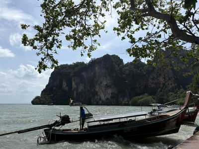 Railay Beach is absolutely beautiful, but very busy by day. From around 8 a.m., there’s a constant hum of long-tail boats coming and going nonstop until sunset. In the evening, it quiets down significantly, with only overnight guests remaining. We highly recommend spending atleast 1 night here.